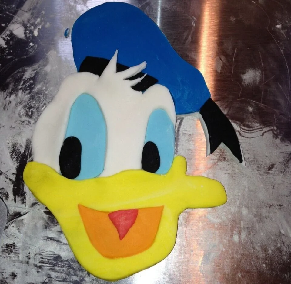 Slowly disassemble the image and create layers with fondant. Cut apart the distinct shapes that make up Donald Duck's face. I started with the little ribbon and the top black band from his hat. Next, I moved to his fluffy feather features, cutting out holes where his eyes would go (while leaving the base layer of white intact). Carefully roll out each feature, layering until you have the final Donald!