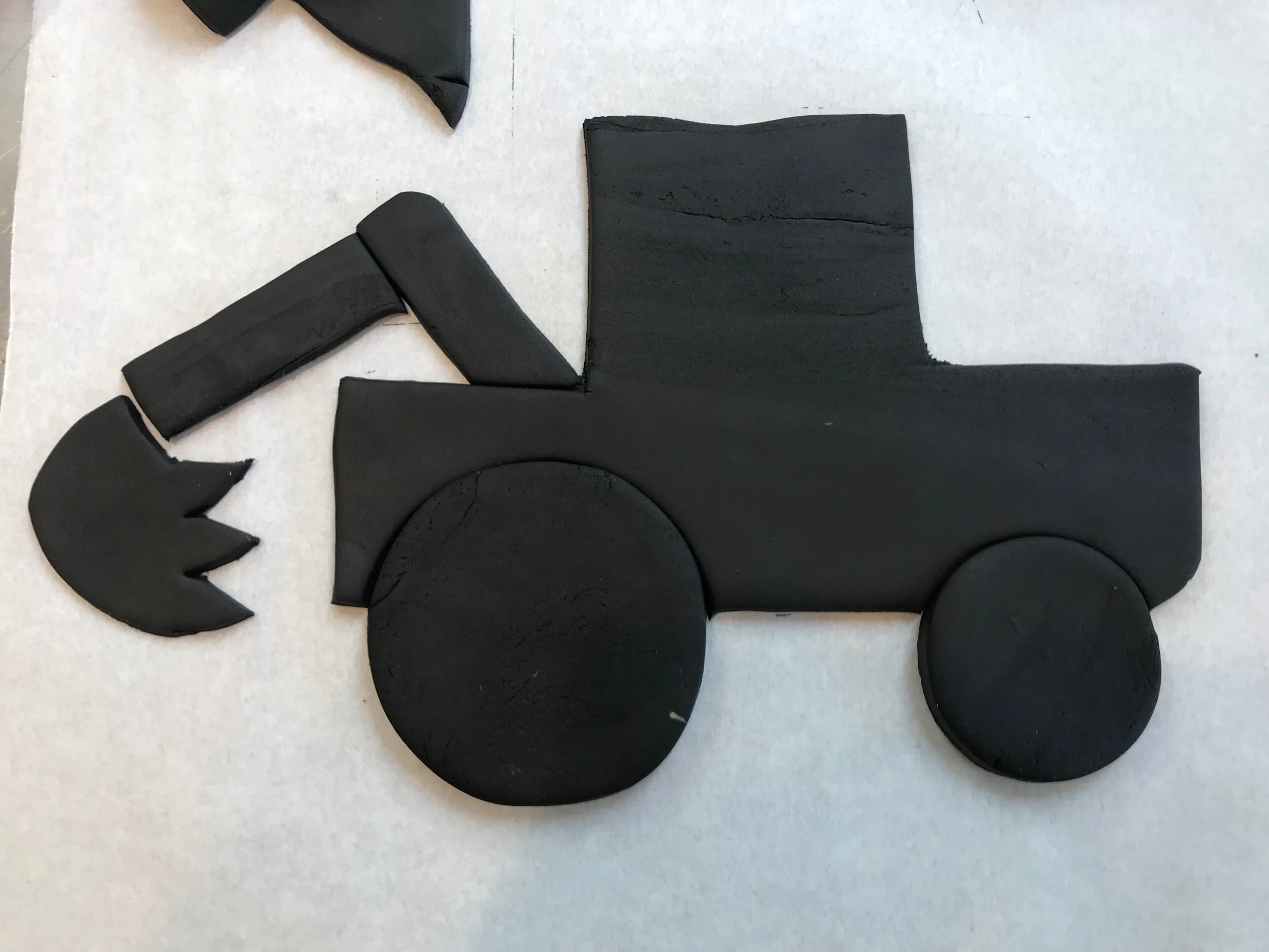 The pictures below show you the step by step cutting out for the digger. Once you have your digger formed you can place it on top of your buttercream frosted or fondant covered cake. If you are using crushed up cookie crumbs for dirt place them on the cake before you pipe the borders.